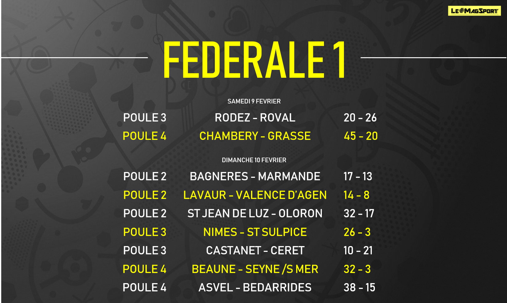 Saint Jean de Luz revient très fort dans le sillage (4pts) du Sporting Club Albigeois en ce mois de février. Les Luziens, qui sont tombés sur un FCO accrocheur, (17/17 à la 44e), ont su patiemment et à l’expérience, passer la sur-multipliée dans le « monney-time ». Avec cette victoire, le SJLO peut encore rêver d’une finale de poule, à Aguilera face aux tarnais lors de la 20e journée. Le SJLO, tête de gondole du rugby basque en fédérale 1, cette saison, continue de surprendre son monde, tant par son jeu léché, que par sa résilience. Pour Oloron, la victoire du Stade Bagnèrais n’est pas une bonne nouvelle, dans l’âpre lutte au maintien. Les hommes du Président Mailié vont devoir à nouveau jouer leur place dans l’élite du rugby amateur, dimanche prochain: en recevant le champion en titre Vauréen.