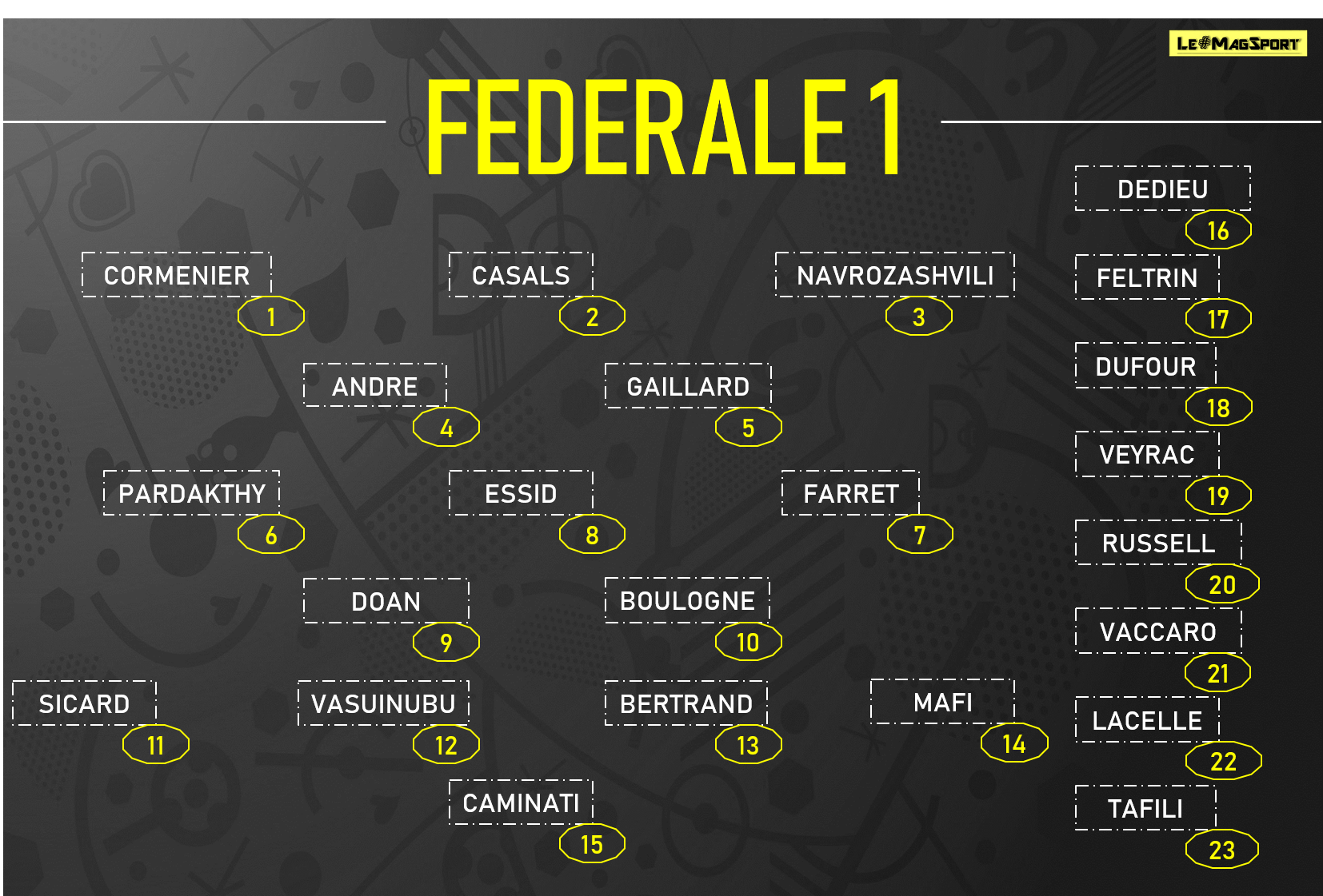 1.Cormemier – 2.Casals – 3.Navrozashvilli – 4.André(Cap) – 5.Gaillard – 6.Pardakhty – 7.Farret -8.Essid – 9.Doan – 10.Boulogne – 11.Sicart – 12.Bertrand – 13.Vasuinubu – 14.Mafi – 15.Caminati.