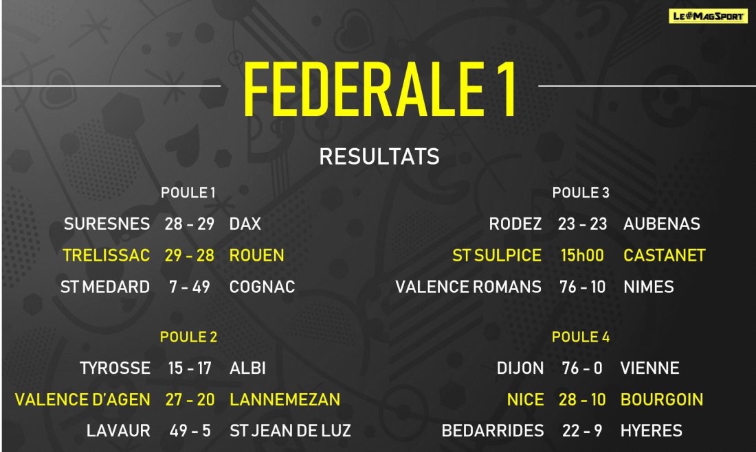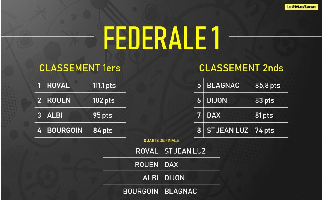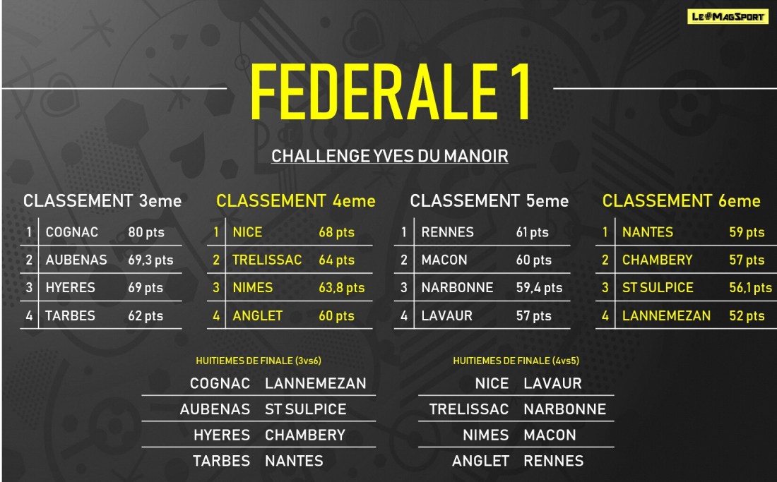 La dernière journée de fédérale 1 vient de livrer son verdict, actant les relégations sportives de La Seyne et Valence d’Agen qui s’en vont rejoindre Saint-Medard, Langon, Nafarroa, Graulhet et Grasse. Mais les derniers résultats ont aussi acté la qualification de Dax en 1/4 du Jean Prat ainsi que Lavaur, Lannemezan, Rennes ou encore Saint- Sulpice en « Du Manoir ». Focus sur ces rencontres et sur les tableaux des phases finales.