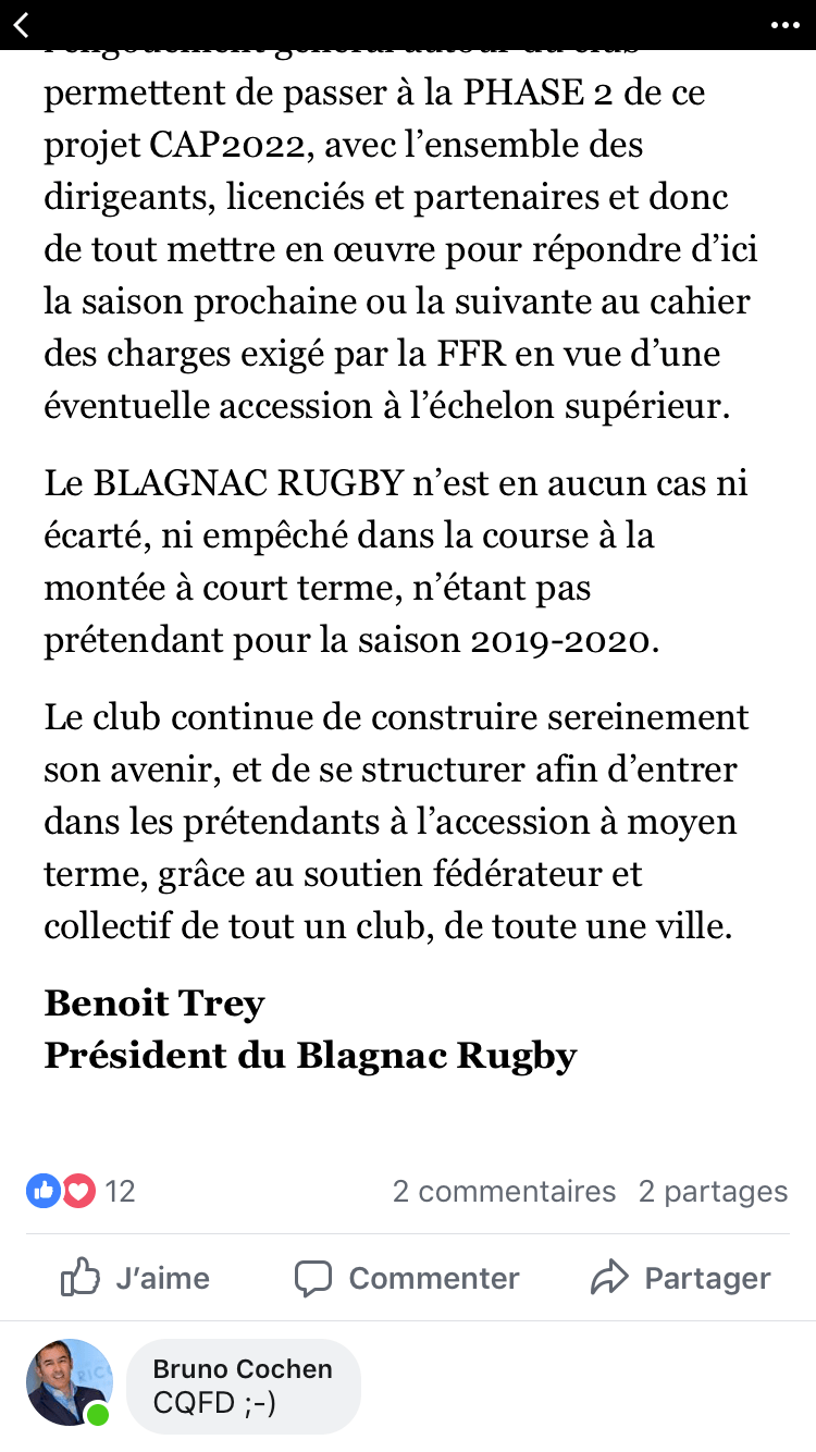 Le président Blagnacais qui se fait une joie d’accueillir « Bourgoin, un bastion historique du rugby » à Ernest Argeles, trouve l’assimilation club « pas éligibles au ProD2 » égal club non vertueux, peu à son goût. Le président de d’abord affirmer « on a aucune surprises ni de regrets, car on n’avait pas vocation à monter cette année. Le staff, les joueurs, les partenaires en étaient informés dès le début de saison. » . Et de rajouter : « Ce qui est malheureux pour des clubs comme blagnac, c’est qu’on se structure dans des pratiques vertueuses, et vu qu’on souhaitait pas « candidater » au ProD2: on est mît à l’index . « .