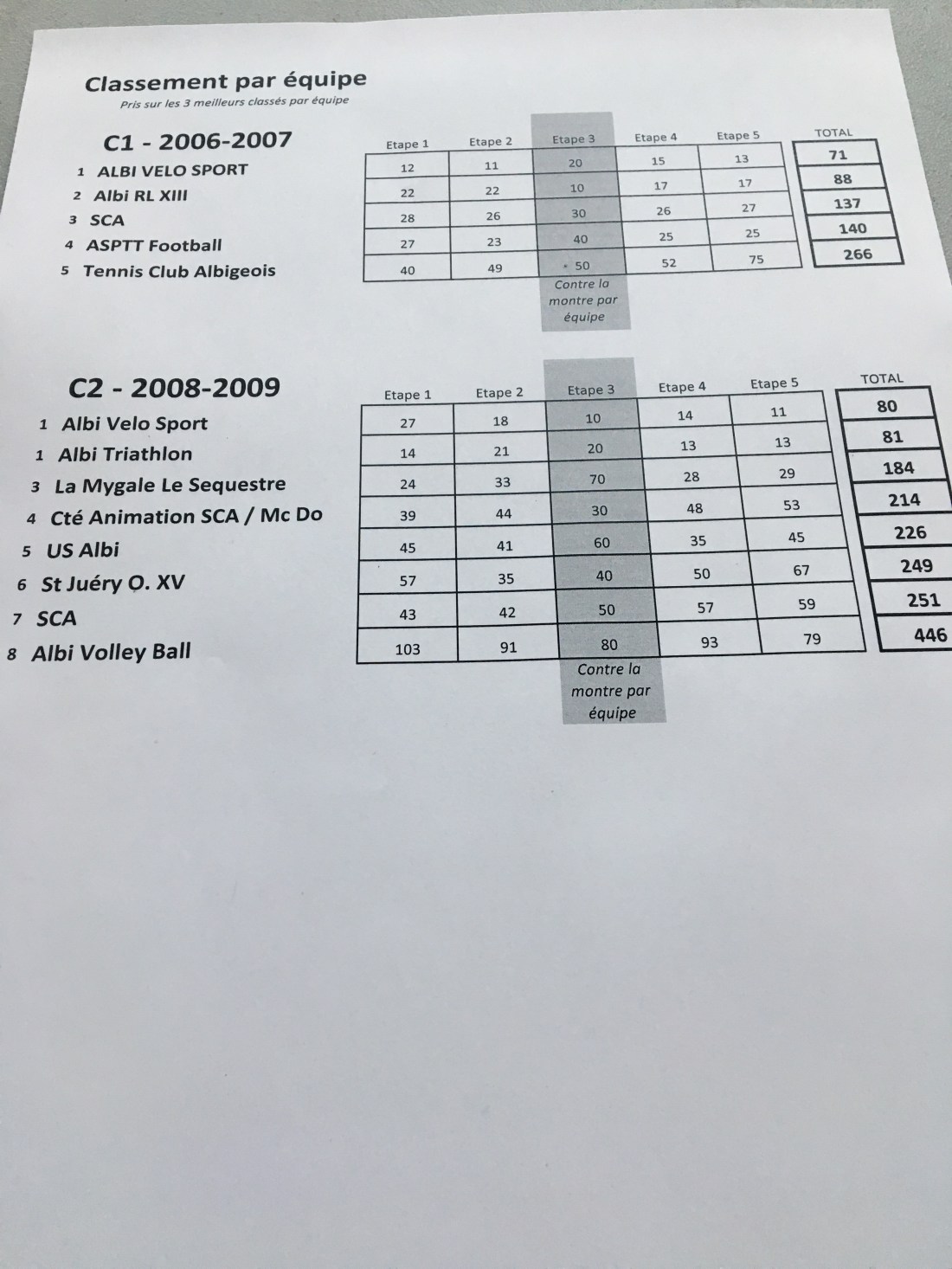 Au classement par équipe Albi Vélo Sport fait le grand chelem en s’imposant dans les deux catégories (2006-2007/2008-2009). Albi Rugby League monte sur la deuxième marche de la catégorie 2006-2007 accompagné du Sporting Club Albigeois. Concernant la catégorie 2008-2009 c’est albi Triathlon (2nd) et La Mygale /Le Séquestre qui montent sur la boîte .