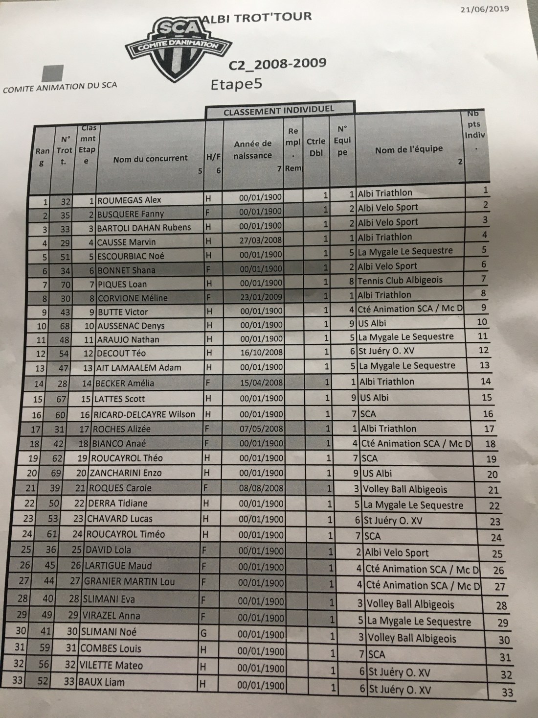 En catégories 2008-2009, Alex Roumegas (Albi Triathlon) déloge, Noé Escourbiac de la 1ere place au général en remportant cette étape de clôture . Noé Escourbiac , n’a donc pu contenir Alex Roumegas qui remporte cette édition , ou la brillante Fanny Busquere, première en catégorie féminine, monte sur la 3eme marche du podium. Cette dernière qui représente Albi Vélo Sport, a en prime terminé seconde de la 5 éme étape devant son coéquipier Rubens Bartoli-Dahans.