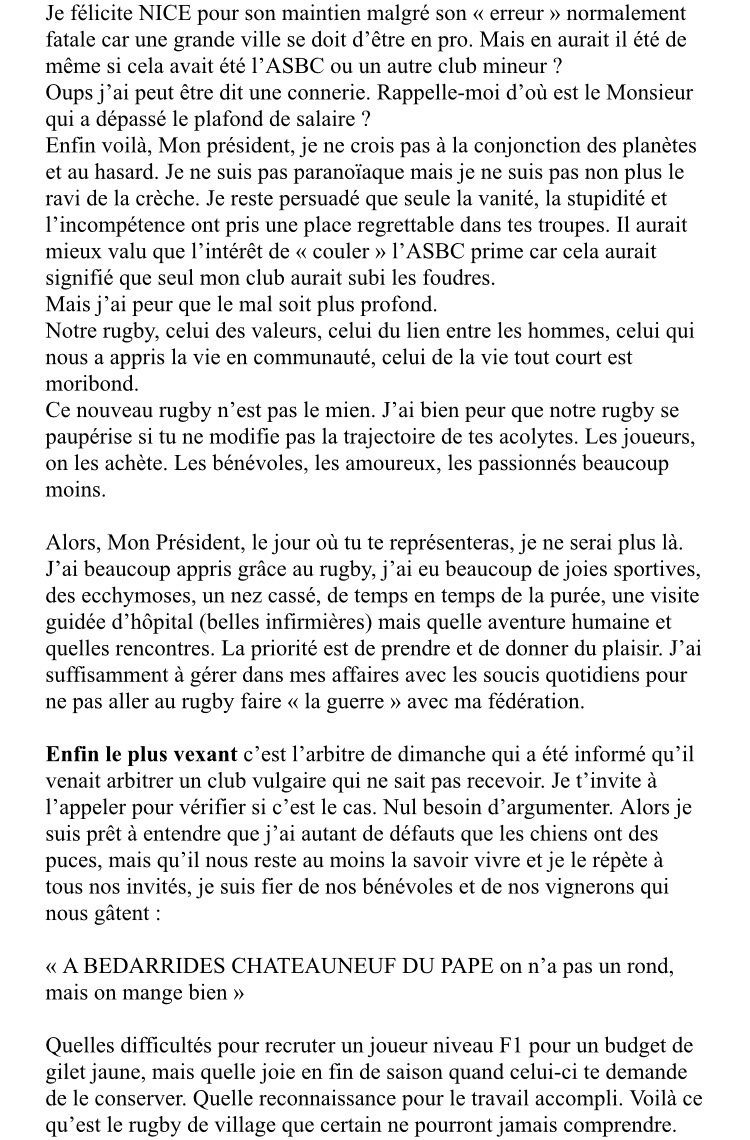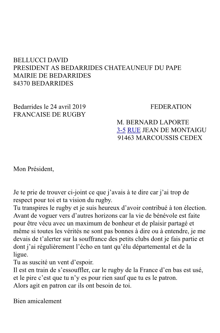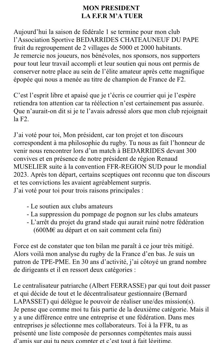 Découvrez ci dessous l’intégralité du courrier envoyé à Bernard Laporte intitulé « Mon Président, la FFR m’a tué ». Ecrit le 24 avril 2019, ce cri du cœur rugbystique teinté de prose typiquement provençale, aux vues des événements récents (Polémique Cardona, Démission T.Murie, bastions historiques en périls) peut paraître prémonitoire.
