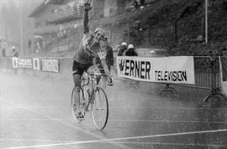 Les spectateurs massés sur le bord de la route malgré les intempéries, encouragent Thévenet, ils portent le bourguignon au sommet à La Mongie, lui qui n’avait jamais grimpé un col des Pyrénées connaîtra un premier frisson de gloire naissante.