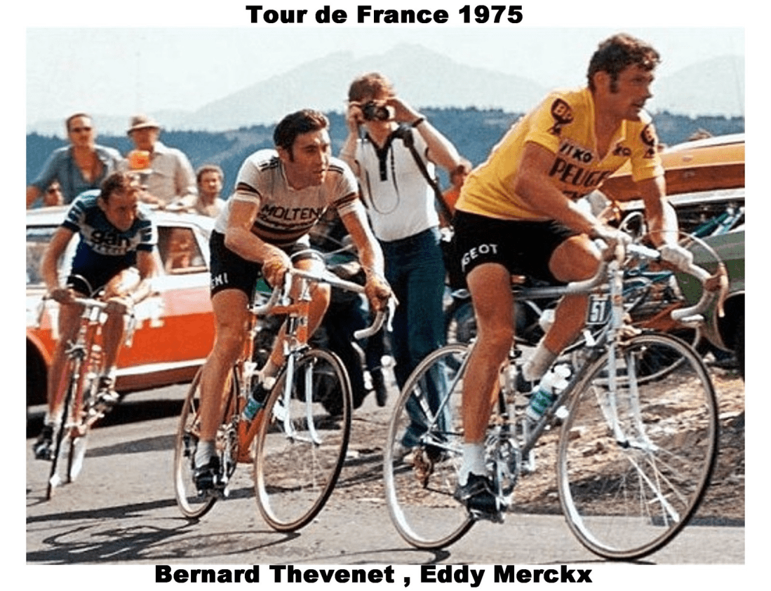 Lors de sa première victoire dans le Tour de France 1975, Bernard Thévenet remportera une deuxième victoire le 14 juillet dans l’étape Barcelonnette-Serres-Chevalier.. Ce jour là, il n’a pas la tunique mythique et emblématique maillot de la Peugeot sur les épaules. En ce 14 juillet, Thévenet porte le maillot jaune de leader du Tour de France. La veille, dans l’étape Nice-Pra Loup, le bourguignon a porté une seule attaque à 2.5 km de l’arrivée, Merckx en jaune, craque, et abandonne le maillot tant convoité au nouveau héros national…