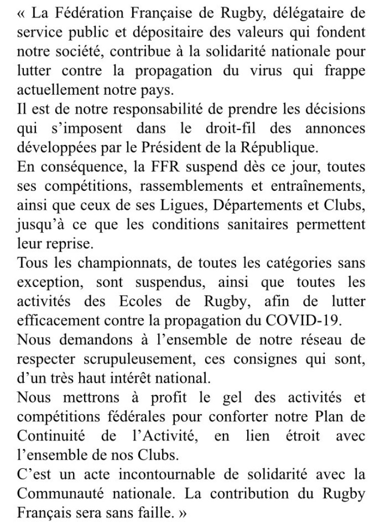 La fédération française de rugby, a l’instar de ses homologues des autres disciplines, vient de suspendre l’ensemble des compétitions amateurs , entraînements et rassemblements dans le cadre des mesures prises pour lutter contre la pandémie Coronavirus -Covid19 .