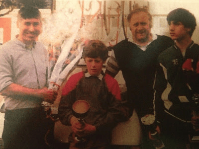 Après sa victoire au Tour de la Vallée de Nohain en mai 1985, entouré de Claude Puech, Georges Jalabert son père, et Nicolas son frère.