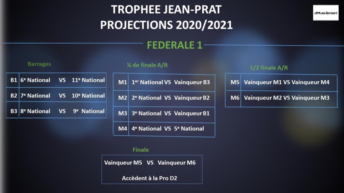 Selon nos sources, lors de l’exercice 2020-2021, les 5 premiers de poules de fédérale 1 seront directement qualifiés pour les 1/4 de finales d’accession au Pro D2. Les 4 premiers au classement national se verraient attribuer le statut de tête de séries pour les playoffs. En outre, pour compléter le tableau, les 5 seconds de poules ainsi que le meilleur 3 eme au classement national , s’opposeraient en match de barrage sec sur le terrain du mieux classé. Les vainqueurs s’offriraient un sésame pour les playoffs Jean Prat, qui s’articuleraient toujours autour d’une double confrontation en 1/4 et en 1/2 avec retour sur la pelouse de la tête de série, ainsi que d’une finale sur un unique match dans une ville hôte.