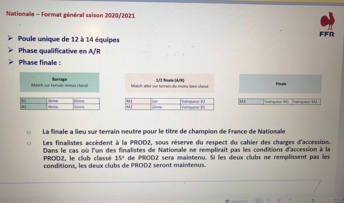 A l’issue des phases régulières de la poule « Nationale » qui aura vu chaque équipe effectuer 26 matchs, les prétendants à l’accession en Pro D2 devront disputer 2 ou 3 matchs de phases finales suivant leur classement, pour décrocher le bouclier de champion de France (dont le naming devrait émerger prochainement). Les deux finalistes arracheront le sésame pour la très convoitée Pro D2. Attention, toujours selon nos informations, à contrario des saisons passées, si d’aventure un des finalistes ne remplissait pas le cahier des charges FFR pour accéder au Pro D2, aucune équipe ne seraient repêchées chez les demi-finalistes. Une subtilité que guetteront les deux derniers de la seconde division professionnelle, car de facto, ils se verraient maintenus au second étage du rugby hexagonal.