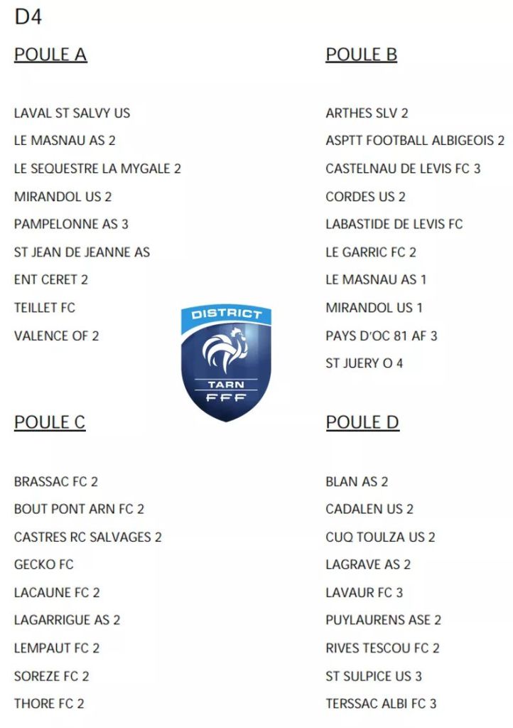 Il n’en manquait plus qu’une dans ley district Tarnais pour faire le compte. Voilà chose faite. Les footballeurs Tarnais pensionnaires de D4 peuvent déjà cocher les derbys qui vont les faire chavirer cette saison dans leurs poules respectives
