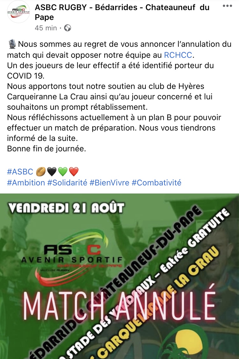 Le RC Hyères Carqueiranne La Crau, déjà obligé d’ annuler son match amical la semaine dernière pour cause de Covid19 dans les rangs du Stade Niçois, se voit lui aussi dans l’incapacité d’honorer son second match amical face a l’AS Bedarrides Chateauneuf du Pape, car lui aussi atteint par l’épidémie de Coronavirus. La vague qui submerge le rugby hexagonal commence à inquiéter le monde la fédérale et de la nationale a quelques semaines de la reprise des championnats . Plus d’informations à suivre.