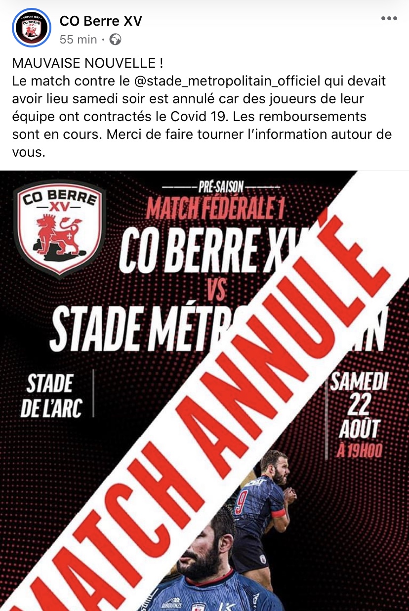 Le CO Berre vient d’annoncer sur les réseaux sociaux l’annulation de son match amical ce week-end, le samedi 22 août, face au Stade Métropolitain (Association de l’ASVEL et Rillieux la Pape) car ces derniers, ont détecté des cas de Covid19 dans leur rang . Après le Stade Niçois (Nationale), le CS Vienne (Fed1), les rhodaniens sont officiellement la 3eme équipe sous giron fédéral à être touché par l’épidémie. Le match amical du Stade Métropolitain face au CS Beaune le 29 août 2020, sera-t-il lui aussi annulé, la question reste en suspens à l’heure actuelle. Plus d’informations a suivre.