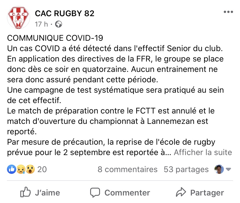 La rumeur a enflé après qu’un cas de Covid19 soit détecté chez un joueur Tarn et Garonnais du « CAC » , amenant le club à annuler son dernier match amical face au FCTT (Fed1) et à se placer en quarantaine. Mais l’avant dernière phrase du communiqué du club de Castelsarrasin prête à confusion, car elle annonce l’annulation pure et simple, de leur 1ere journée de championnat face à … Lannemezan. Une affirmation que le club des Hautes Pyrénées trouve prématurée, car leurs futurs adversaires ne présentent à l’heure où nous écrivons ces lignes, qu’un seul cas avéré. Pour Bernard Duclos le co-Pdt de l’équipe du Plateau : » L’annulation du match n’est aucunement officielle, elle le sera si la fédé nous envoie, une décision en ce sens. Pour le moment, on n’a rien reçu…! »