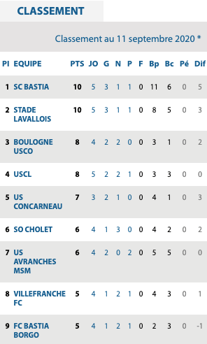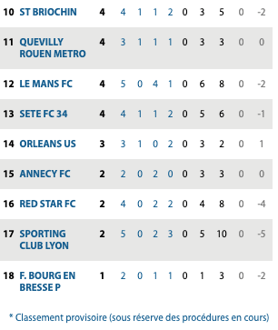 | Boulogne USCO 0 / 0 Le Mans FC SO Cholet 1 / 1 Stade Lavallois SC Bastia 3 / 1 Bourg en Bresse US Avranches 0 / 2 Bastia Borgo SC Lyon 0 / 0 USCL Red Star 0 / 2 Villefranche Annecy / Concarneau reporté ST Briochin / Orléans reporté Quevilly / Sète reporté |