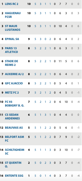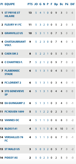 | Caen II 0 / 0 Lorient II C’Chartres 3 / 0 Guingamp II Fleury 0 / 0 Rouen St Malo 2 / 2 Blois St Pyrvé St Hilaire 2 / 1 Versailles Poissy 1 / 2 Granville Plabennec 1 / 1 Chateaubriant Vannes 0 / 1 Ste Geneviève | St Quentin 1 / 2 Ajaccio GFCO Schiltigheim 0 / 0 Beauvais Metz II 2 / 2 Belfort Sedan 1 / 1 Auxerre II Bobigny 1 / 3 Epinal St Maur 1 / 2 Haguenau Entente SSG 1 / 2 Lens II Paris Athlético 1 / 1 Reims II | Fréjus 2 / 0 Marignane Hyères 2 / 0 Louhans Cuiseaux Lyon II 1 / 1 Rumilluvallières Jura Sud 0 / 2 Aubagne Martigues 2 / 1 Andrézieux Monaco II 2 / 0 Toulou Grand Ouest 2 / 1 Grasse OM II / St Priest reporté | Bergerac 1 / 1 Béziers Angoulème 1 / 0 Les Herbiers Romorantin 3 / 0 Chamalières Colomiers 2 / 1 Moulins Yzeure Nantes II / Trélissac Bourges 18 1 / 2 Canet Stade Montois 0 / 4 Bourges Angers II / Le Puy reporté |