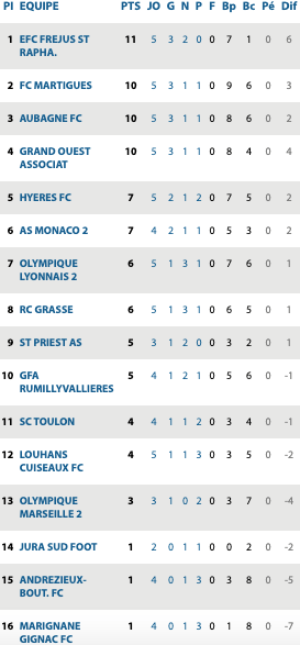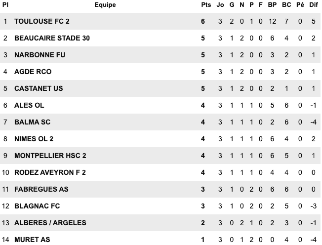 | Nîmes II 1 / 1 Agde Balma 1 / 0 Blagnac Alès 4 / 3 Toulouse II Muret 0 / 0 Castanet Albères Argeles 2 / 2 Beaucaire Montpellier II 4 / 2 Fabrègues Rodez II 1 / 1 Narbonne |