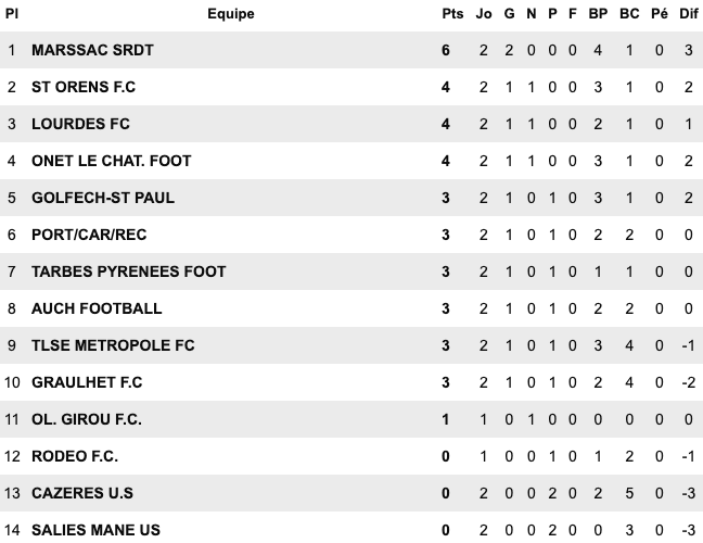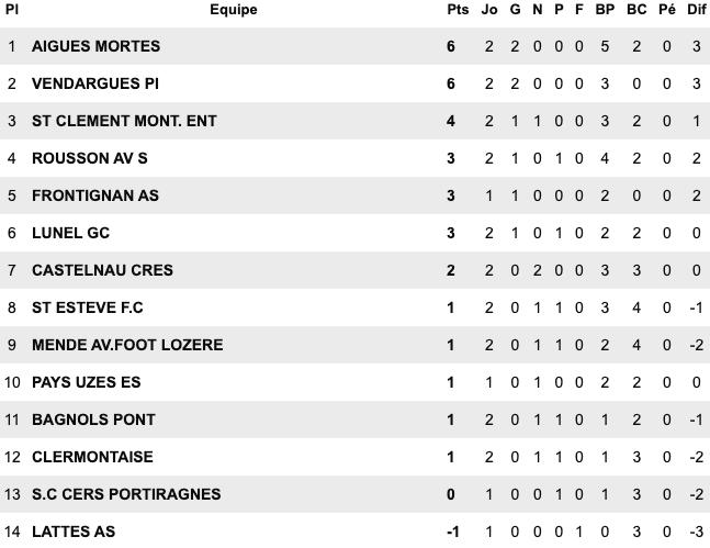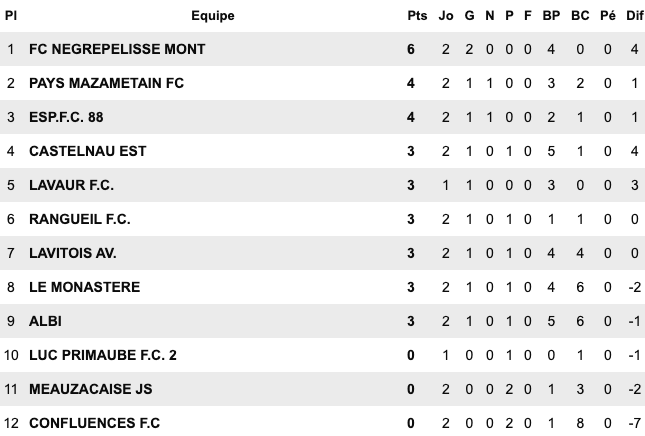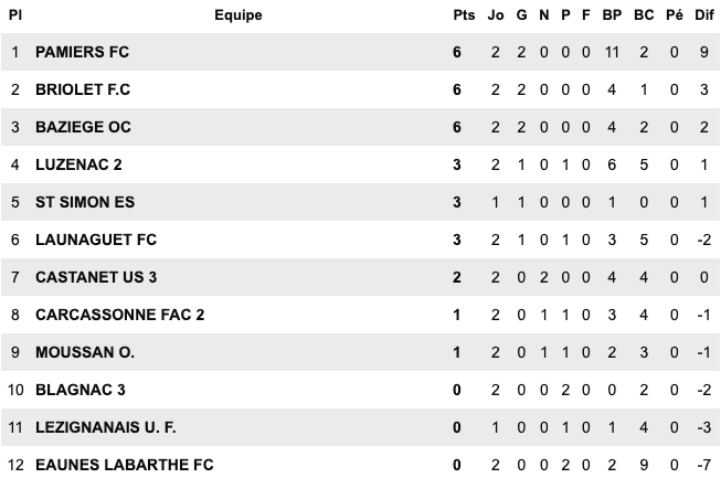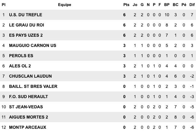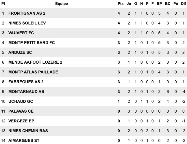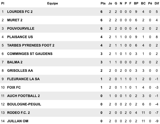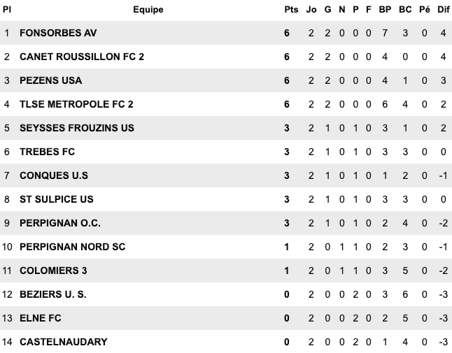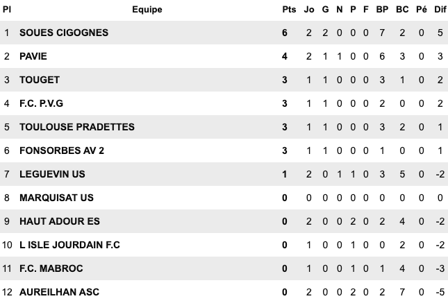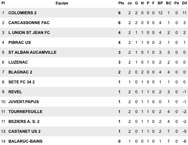 | Le Grau du Roi 6 / 1 Montp Arceaux Chusclan Laudun 2 / 1 Alès II Pays Uzès II 5 / 1 St Jean Vedas US du Trèfle 6 / 2 Aigues Mortes II Sud Hérault 1 / 2 Baill. St Bres Perols / Mauguio Carnon reporté | FU Narbonne II 5 / 3 Cabestant St L.Salanque 2 / 3 Pignan Rivesaltes 0 / 0 St André Sangonis Montagnac 0 / 0 Mèze St Estève II 2 / 2 Gruissan Corbières 0 / 2 Gignac | Carcassonne II 2 / 2 Castanet III Launaguet 1 / 0 Moussan Briolet 3 / 1 Luzenac II Pamiers 4 / 1 Lezignan Baziège 4 / 1 Eaunes Labarthe St Simon 1 / 0 Blagnac III | Léguevin 2 / 2 Pavie Mabroc 1 / 4 Soues Cigognes Haut Adour 2 / 3 Toulouse Pradettes Aureilhan 1 / 4 Touget Fonsorbes II / L’Isle Jourdain reporté Marquisat / FC PVG reporté |