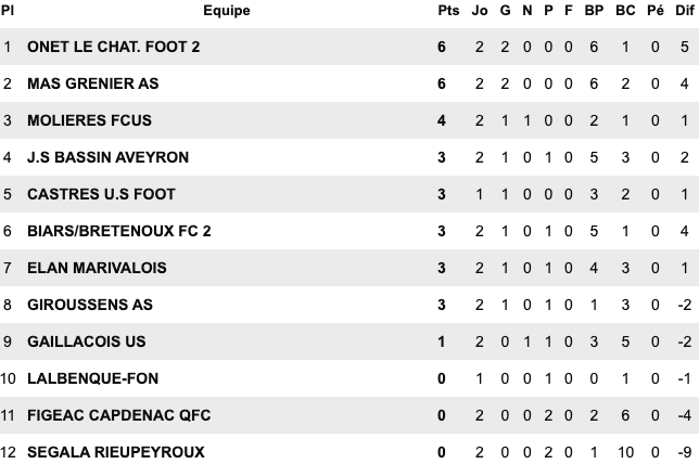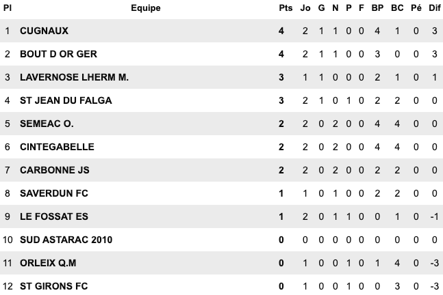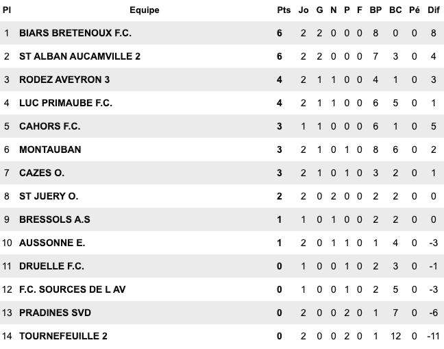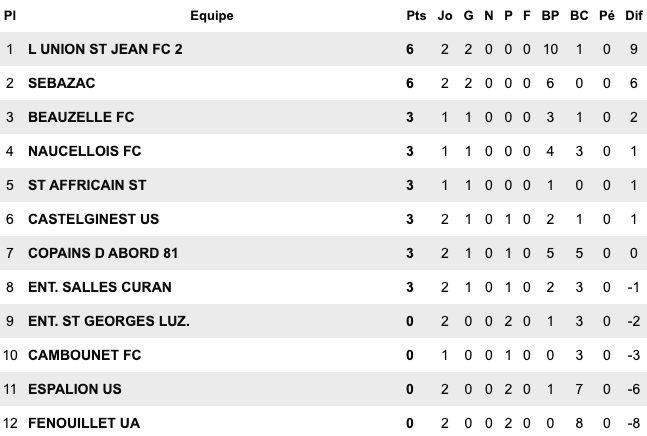 | Cugnaux 4 / 1 Orleix St Jean du Falga 1 / 0 Le Fossat Semeac 2 / 2 Cintegabelle Carbonne 0 / 0 Bouton d’Or Sud Astarac / St Girons reporté Saverdun / Lavernose Lherm reporté | Figeac Capdenac 2 / 5 Mas Grenier Segala Rieupeyroux 1 / 5 Onet II Molières 1 / 0 Biars Bretenoux II Elan Marivalois 4 / 2 Gaillac Bassin Aveyron 3 / 0 Giroussens Castres 3 / 0 Lalbenque | Salles Curan 1 / 0 St Georges Naucelle 4 / 3 Copains d’Abord Sebazac 3 / 0 Cambounet L’Union St Jean II 5 / 0 Fenouillet Castelginest 2 / 0 Espalion Beauzelle / St Affrique reporté | Lavaur 3 / 0 Le Monastère Confluences 0 / 3 Negrepelisse Castelnau Estretefonds 5 / 0 Albi Esp FC 88 1 / 1 Mazamet Lavitois 1 / 0 Meauzac Rangueil 1 / 0 Luc Primaube II |