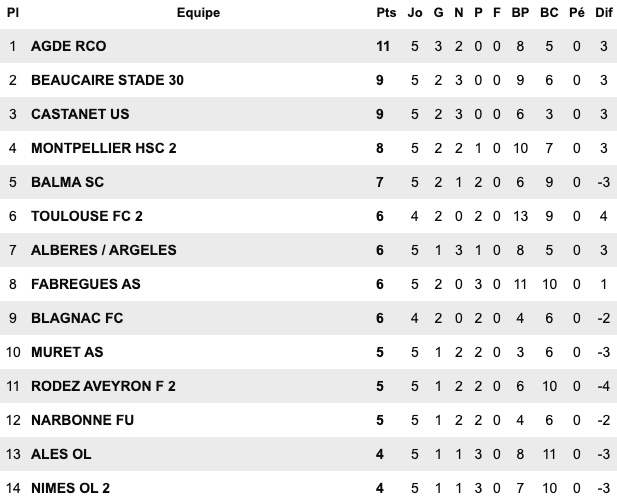 | Rodez II 1 / 1 Beaucaire Nîmes II 0 / 2 Castanet Balma 3 / 1 Fabrègues Alès 2 / 3 Agde Muret 1 / 1 Albères Argeles Montpellier II 2 / 0 Narbonne |