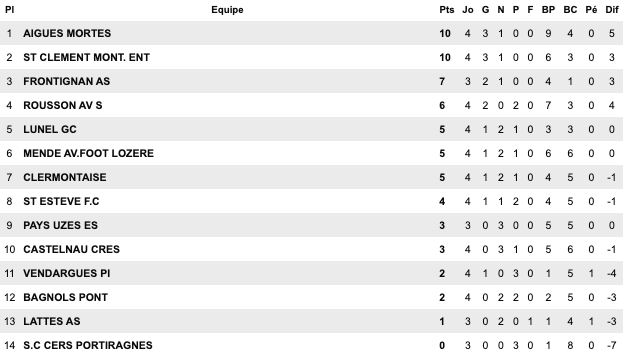 | Mende 2 / 2 Clermontaise Lattes 0 / 0 Lunel Frontignan 1 / 1 Pays Uzès Castelnau Cres 1 / 2 St Clément Vendargues 0 / 1 St Estève Aigues Mortes 2 / 0 Bagnols Cers Portiragnes 0 / 3 Rousson | Colomiers II 1 / 0 Sète II Tournefeuille 1 / 2 Béziers II Blagnac II 1 / 0 St Alban Aucamville Revel 3 / 1 L’Union St Jean Castanet II 1 / 1 Pibrac Juventus Papus 1 / 1 Luzenac Balaruc 2 / 0 Carcassonne | Onet 0 / 2 Auch Cazères 2 / 1 Salies Mane Toulouse Rodéo 2 / 1 St Orens Portet 4 / 0 Girou Tarbes 2 / 1 Graulhet Marssac / Lourdes reporté Golfech / Toulouse Métropole reporté |
