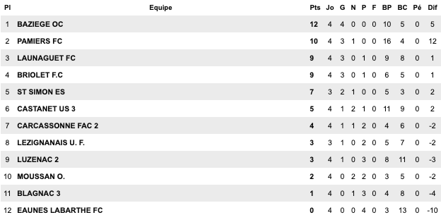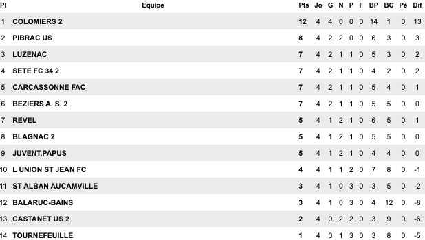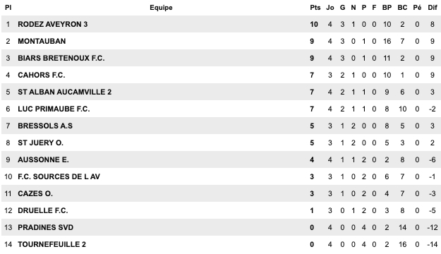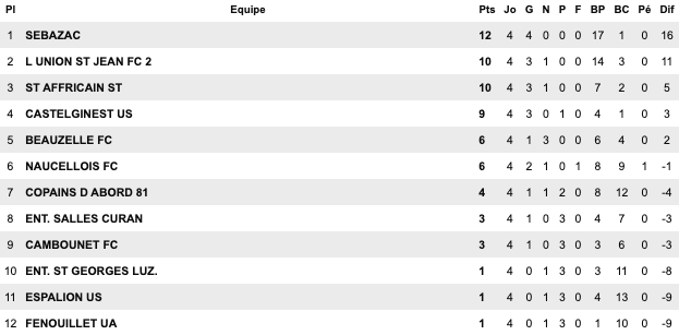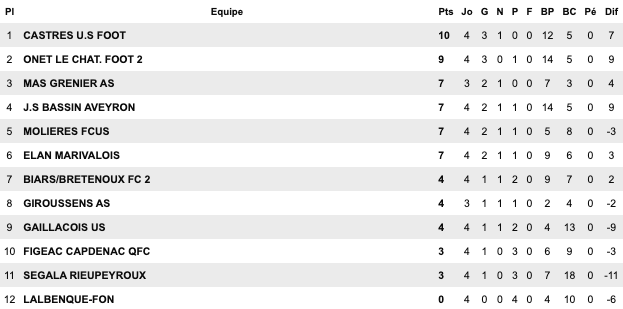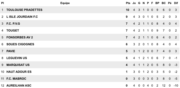| Cugnaux 3 / 1 Bouton D’Or St Jean du Falga 1 / 1 St Girons Cintegabelle 0 / 1 Lavernose Lherm Saverdun 4 / 2 Orleix Séméac 2 / 3 Le Fossat Carbonne 1 / 1 Sud Astarac | Molières 2 / 1 Lalbenque Figeac 4 / 2 Biars Bretenoux II Bassin Aveyron 8 / 1 Gaillac Castres 5 / 2 Ségala Elan Marivalois 3 / 2 Onet II Giroussens / Mas Grenier reporté | Sébazac 6 / 0 St Georges L’Union St Jean II 2 / 2 Copains d’Abord St Affrique 4 / 1 Espalion Castelginest 1 / 0 Cambounet Beauzelle 1 / 1 Fenouillet Sales Curan 1 / 2 Naucelle | Castelnau d’Estrétefonds 2 / 0 Luc la Primaube II Lavaur 1 / 2 Mazmet Albi 2 / 4 Negrepelisse Confluences 2 / 2 Le Monastère Espoir FC 2 / 0 Lavit Rangueil 3 / 2 Meauzac |