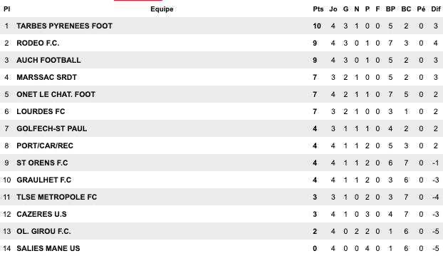 Chez les nostalgiques du football Bigourdan, on ne peut que se remémorer les belles soirées de National 2 au Stade Trélut après la chute du club. Aujourd’hui candidat annoncé à la remontée en N3, les Tarbais semblent pour le moment tenir leur rang en prenant les rennes de leur poule C de Régional 1. Comptant parmi les dernières équipes invaincues (avec Marssac et Lourdes dont l’affrontement a été reporté ce week-end), les Tarbais suivent un rythme qui fait plaisir à voir…