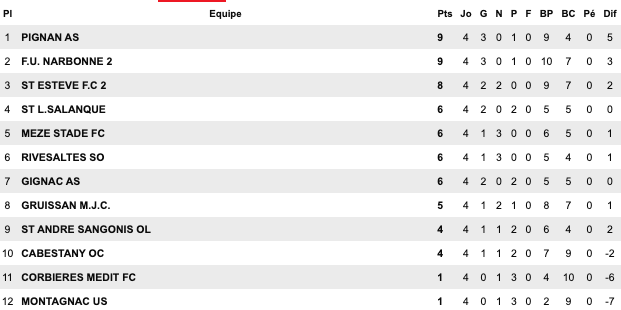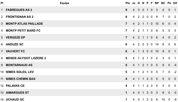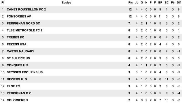 | Le Grau du Roi 2 / 1 Alès II Perols 2 / 1 Baillargues Uzes II 1 / 2 Maugio US Trèfle 2 / 0 Arceaux Sud Hérault 0 / 4 Chusclan St Jean Vedas / Aigues Mortes II | Saint-Laurent 2 / 0 Gignac Rivesaltes 1 / 1 Cabestany Gruissan 1 / 2 Meze Montagnac 0 / 1 Pignan St Estève II 2 / 1 Saint-André Corbières 0 / 3 Narbonne II | Pamiers 3 / 0 Luzenac II Briolet 1 / 4 Castanet III Eaunes Labarthe 1 / 3 Lézignan Baziège 4 / 2 Blagnac III Carcassonne II 0 / 2 Lauragais St Simon 1 / 1 Moussan | Toulouse Pradettes 2 / 1 Soues Cigognes Léguevin 2 / 1 FC PVG Mabroc 2 / 3 Touget Haut Adour 1 / 1 Pavie Fonsorbes II 2 / 0 Marquisat Aureilhan 0 / 2 L’Isle-Jourdain |