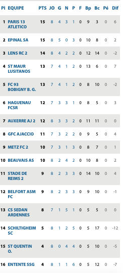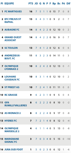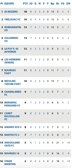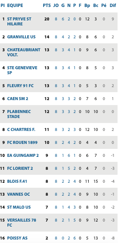 | Versailles 1 / 3 C’Chartres Lorient II 1 / 1 Saint Malo Granville 0 / 0 Fleury Chateaubriant 0 / 0 St Pryvé St Hilaire Rouen 1 / 1 Guingamp II Ste Geneviève 3 / 1 Blois Vannes 0 / 0 Caen II Plabennec 4 / 3 Poissy | Hagueneau 1 / 1 Schiltingheim Epinal 0 / 2 Paris Athletico Entente SSG 0 / 1 Bobigny Belfort 0 / 0 St Quentin Beauvais 4 / 1 Auxerre II Lens II 3 / 2 Reims II Metz II / St Maur Lusitanos | Monaco II 3 / 3 Jura Sud Andrézieux 5 / 0 Hyères Grasse 3 / 0 Lyon II Aubagne 0 / 0 Fréjus Louhans Cuiseaux 4 / 1 Marseille II Martigues 3 / 1 Grand Ouest Toulon 4 / 1 Marignane Gignac Rumillyvallières 2 / 4 St Priest | Béziers 0 /0 Nantes II Romorantin / Bergerac reporté Le Puy 4 / 1 Stade Montois Canet 0 / 0 Moulins Trélissac 1 / 1 Bourges Chamalières / Angers II reporté Bourges 18 5 / 0 Angoulème |