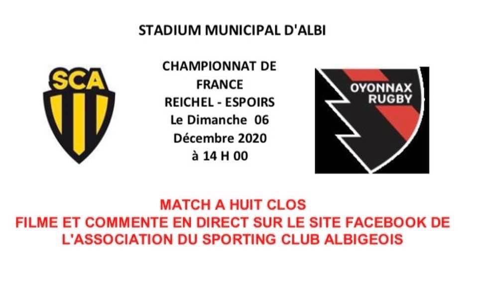 Retrouvez la rencontre de la septième journée de la poule accession Elite Espoirs opposant les jaunes etnoirs du Sporting Club Albigeois , aux club du du Haut Bugey d' Oyonnax en direct live dans « Le #MagSport / Studio H2G » avec Loïc Colombié et Didier Revellat dès 13h45 ce dimanche 6 décembre 2020. Vivez les matchs en live vidéo et audio au coeur du Stadium Municipal d'Albi. Pour suivre le match en direct … Lire la suite #DirectRugby : suivez (dès 13h45) le « Live » Albi Vs Oyonnax (#Espoirs #J7)