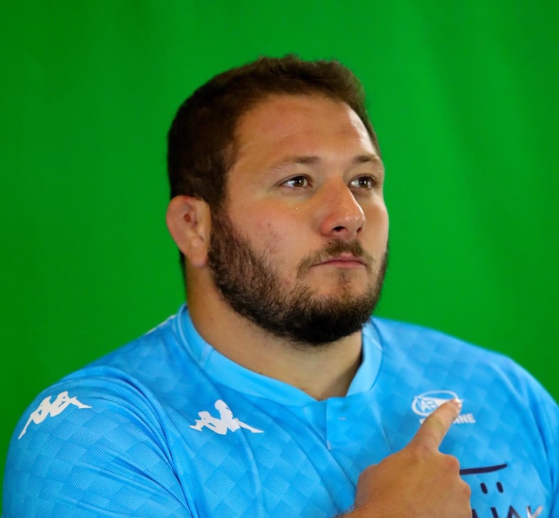 Pour le bleu, comme tu le disais, on va peut-être y aller étape par étape (rires). C’est vrai que, pour la première saison, j’ai totalisé 4 matchs de Top 14 et 4 matchs de Challenge Européen mais comme je le disais, ça a été un pari pour Yannick. Il a pu voir un petit peu comment je répondais à ses attentes, j’avais signé un contrat de 1 + 1 et en Novembre, le club est revenu vers moi pour me prolonger pour deux saisons supplémentaires. Donc, je savais que j’avais la confiance du club mais aussi le potentiel, j’avais démontré que je pouvais rivaliser à ce niveau même si nous avons connu aussi connu l’épidémie qui nous a coupé la saison. Le début de cette 2e saison est aussi compliqué par rapport à ça mais j’ai quand même réussi à avoir du temps de jeu mais c’est vrai que c’est un éternel recommencement. Chaque semaine, il faut travailler dur, il faut prouver, à chaque minute sur le terrain, il faut faire des prestations très convaincantes pour pouvoir rester dans la course. Donc, c’est déjà essayer de rester à ce niveau avec l’Aviron à savoir être dans le plus haut-niveau français qu’est le Top 14. Il faut s’entraîner dur pour espérer une place de titulaire et ça, c’est mon objectif et donc, s’installer en Top 14 même si le mot » s’installer » n’est jamais acquis.