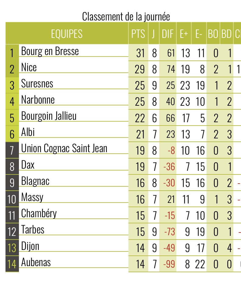 Première partie de la 15e journée de championnat de Nationale ce samedi ! Des rencontres très serrées qui ont laissé la part belle au suspens. Ce dimanche cette 3eme levée depuis le re-start de l’échelon passerelle avec la Pro D2 , nous offrait une opposition de style entre deux équipes en formes (Cognac et Narbonne) un match charnière (Suresnes et Aubenas) et deux favoris (Nice et Bourg) accueillant des outsiders en mal de points (Tarbes et Dijon). Un véritable plat de résistance.