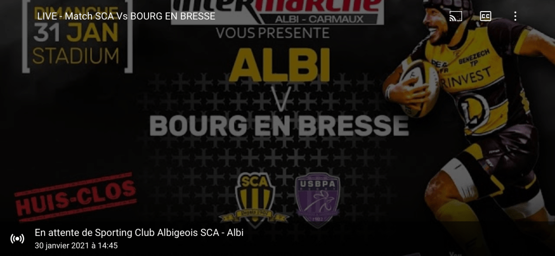 Retrouvez la rencontre de Nationale lors de 16 eme journée qui oppose les jaunes et noirs du Sporting Club Albigeois , aux leaders bressans de l’USBPA en direct live tv dans « Le #MagSport / H2G » avec Loïc Colombié, Arthur Castant, et Jean Christophe Bacca dès 14h45 ce dimanche 31 janvier 2021. Une retransmission à retrouver sur le facebook officiel du SCA et sur la page you tube du Sporting Club Albigeois . Vivez dans votre canapé le choc du rugby fédéral en live vidéo du Stadiumd’Albi.