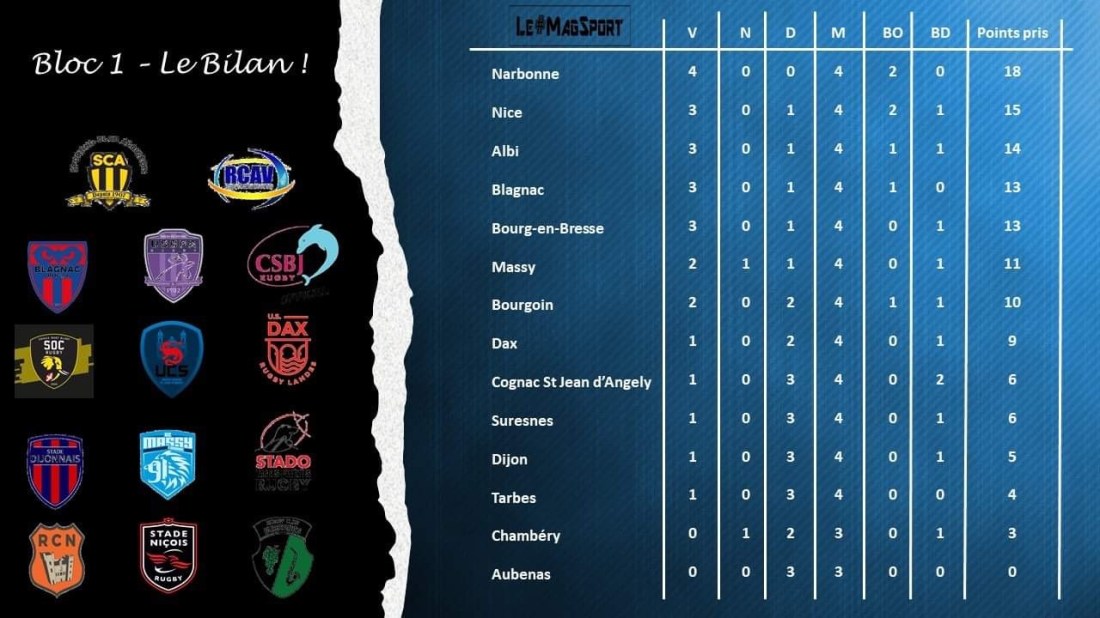 Le premier bloc de Nationale s’est donc achevé ce dimanche. Un bloc qui a tenu toutes ses promesses pour des joueurs qui rongeaient leurs freins depuis mi-Octobre, sevrés de compétitions qu’ils étaient. De plus, le nouveau format de compétition (les 4 premiers qualifiés pour les play-offs de Pro D2 au lieu des 6 initialement prévus) a forcément rebattu les cartes et accordé encore moins de droit à l’erreur, si tant est que l’on puisse parler de droit à l’erreur dans cette poule extrêmement relevée.