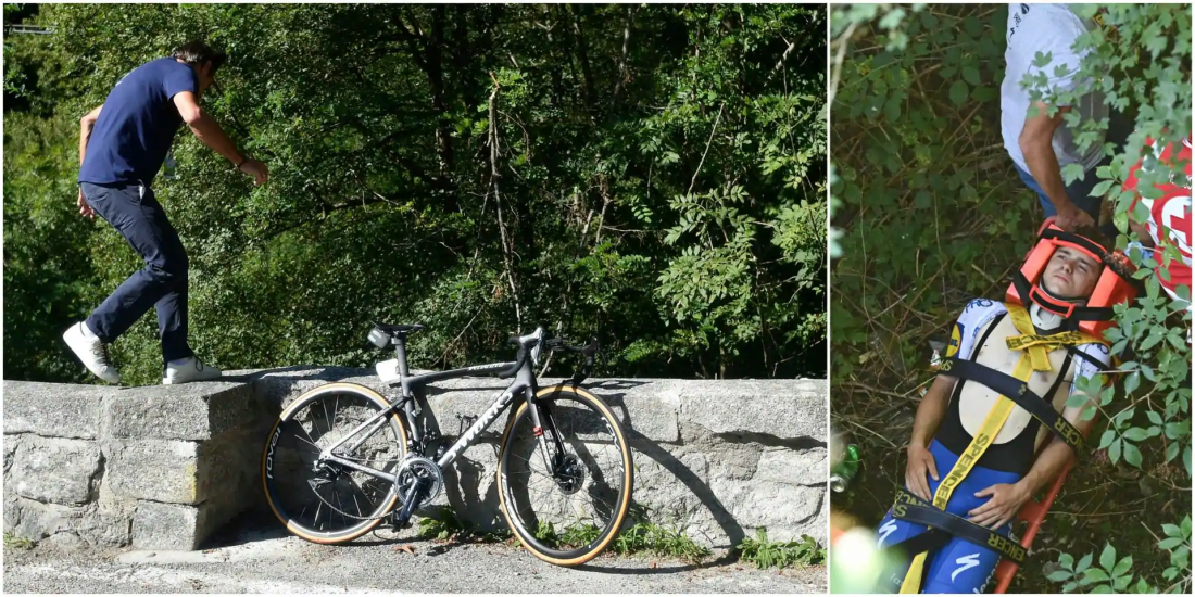 L’espoir belge a manqué un virage dans la descente d’un col, son vélo a percuté le parapet d’un pont, et le coureur a fait une chute estimée a 10 mètres de haut, atterrissant sur la roche brute.