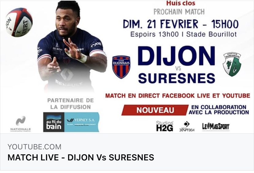 Retrouvez la rencontre de Nationale lors de la 18 eme journée qui oppose les rouges et bleus du stade Dijonnais , aux altosequanais du RC Suresnes en direct live tv dans « Le #MagSport / H2G » avec Loïc Colombié, Romain Brunot, et Jean Christophe Bacca dès 14h45 ce samedi 20 février 2021. Une retransmission à retrouver sur le facebook officiel du Stade Dijonnais et sur la page you tube du club . Vivez dans votre canapé ce choc du rugby fédéral en live vidéo du stade Bourillot .