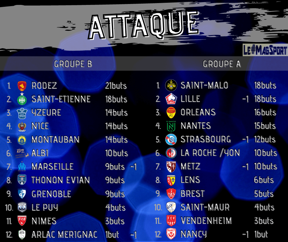 La meilleure attaque de la D2 Féminine reste Rodez avec 21 buts marqués dont 5 par Selen Altunkulak et 8 par Alexandra Lamontagne, meilleure buteuse de D2 devant Laury Jesus (6 buts) avec l’ASSE. Dans le groupe B, on retrouve Saint-Malo et Lille respectivement amené par Alexandra Banner (6 buts) et Noémie Mouchon (6 buts). Notons égalementt l’excellent début de saison d’Ikram Adjabi avec Orléans (6 buts) et d’Anaïs Ribeyra avec Nantes (6 buts).