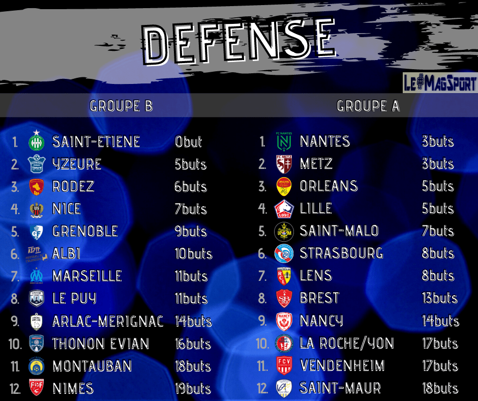 Sans surprise, on retrouve le leader du Groupe B en tête du classement avec aucun but encaissé en six matchs. Plus de 540 minutes pour Gabrielle Lambert et Joanna Viollaz, les portières des Vertes, sans encaisser le moindre but. On retrouve ensuite les Nantaises de Kinga Szemik et les Messines de Justine Lerond avec seulement trois buts encaissés.