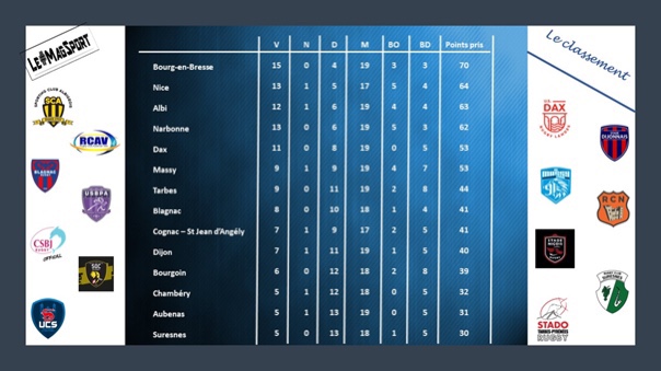 Cette dernière journée de rattrapage en Nationale a rendu son verdict … et on connaît les 4 qualifiés pour les play-offs et la course à la Pro D2 ! Reste maintenant à tout donner lors de la 26e et ultime journée pour savoir qui affrontera qui et où … Le suspens reste à son comble !