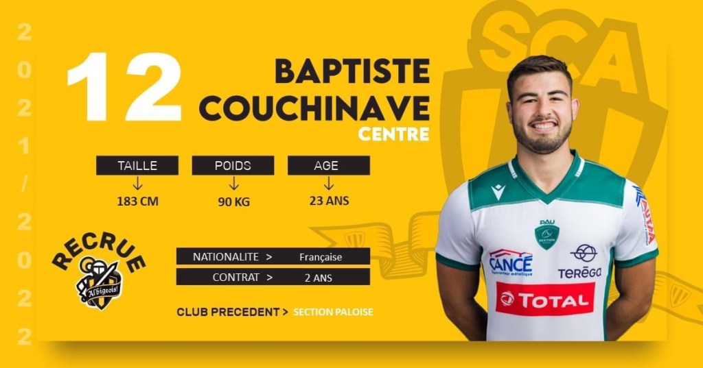 Baptiste Couchinave (24 ans) est donc la seconde recrue du SCA (Après Enzo Marzocca / Dijon) lors de cette intersaison 2021, qui voit le club de la préfecture du Tarn faire sa mue estivale. Cet enfant du Béarn, ayant fait ses classes dans le club de son village natal, l’US Josbaig, a tout d’abord continué son cursus via le FC Oloron en double licence, pour ensuite intégrer le centre de formation de la Section Paloise. Membre de l’effectif qui a participé à la dernière épopée du FC Oloron (1/2 finale Jean Prat en 2018), Baptiste Couchinave est un 3/4 centre aux mensurations modernes : 1,83 pour 93 kg.