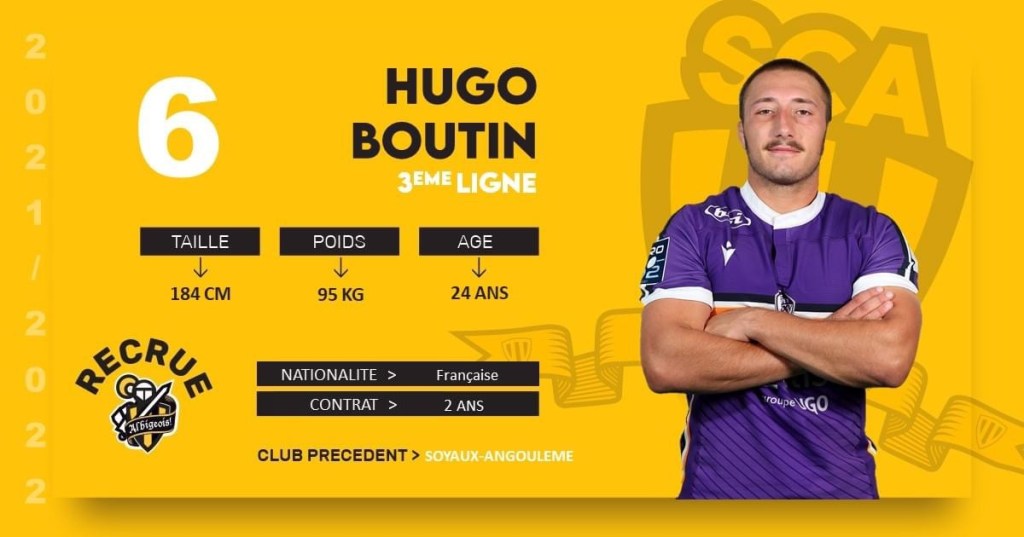 La troisième recrue des jaunes et noirs, arrive elle aussi de Pro D2, puisqu’elle a effectué 14 matchs cette saison dans l’antichambre du Top 14. Il ne s’agit ni plus ni moins que d’Hugo Boutin, le 3eme ligne aile de Soyaux Angoulême. Fils d’un ancien entraîneur du SCA mais celui des Charentes (le Sporting Club Angoulême ancêtre du SAXV ), ce flanker de 24 ans dont le potentiel s’est totalement révélé cette saison, quitte un peu à la surprise générale son cocon angoumoisin. En effet, en avril dernier, le 3eme ligne du SAXV formé au Stade Rochellais, déclarait à nos confrères de Sud Ouest : « J’ai envie de continuer l’aventure! » . Mais entre-temps, les résidents du Stade Chanzy ont subit une relégation en Nationale, et le président Pitcho et son manager Vincent Etcheto, ont engagé une grande opération dégraissage (20 départs pour 5 arrivées actuellement). Hugo Boutin a donc décidé d’accepter le challenge albigeois et d’adhérer au projet de jeu du nouveau staff. Son arrivée va permettre de compenser le départ de Paul Farret à Aurillac, pour ce joueur au gabarit athlétique (1,83 mètres pour 95 kg).