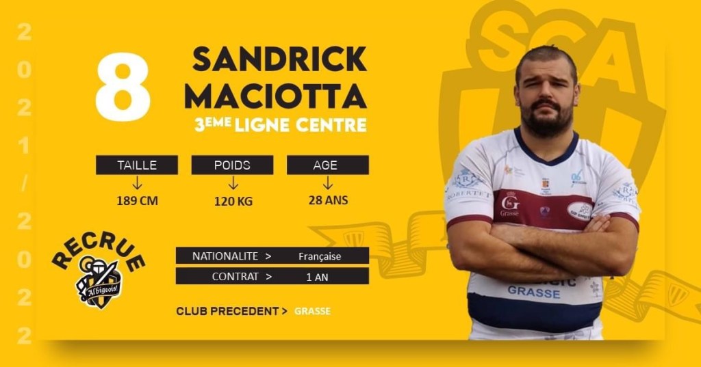 Mathieu Bonello, arrive à Albi dans un groupe façonné par Arnaud Méla, et veut donc imprimer sa patte sur le vestiaire albigeois. Pour se faire, l’ex manager de Lavaur, a choisi un de ses ex poulains pour venir épaissir le pack jaune et noir. Le 3eme ligne centre Sandrik Maciotta, du RC Grasse (fédérale 2), champion de France 2018 avec Lavaur (fédérale1), vient de s’engager avec le club de la préfecture tarnaise. Ce gaillard de 120 Kg, va tenter un joli rebond au Sporting Club Albigeois.