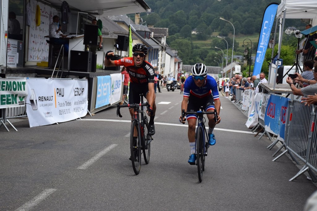 La course est très rapide les coureurs parcourent près de 49km/h la 1ère heure et 48 la 2ième heure. Ils arrivent au pied du Soulor après 2h30 de course et sont encore de nombreux. Une chute dès le pied du col va mettre quelques coureurs à terre. Dans cette montée longue de 12 km, le brouillard est présent par endroit, les animaux se baladent et se couchent parfois sur le goudron cherchant la chaleur accumulée. Durant la montéeun groupe dont le champion de France Axel Mariault, et son co-équipier Louis Barré (UC Nantes). Mais aussi des Occitans comme le lotois Clément Delcros et le Biterrois Forent Castellarnau. La montée vers l’Aubisque est le deuxième col de l’étape puis vient la descente vers Gourette. Ces routes,Florent les connait bien car lors des séjours dans sa belle famille il les pratiques régulièrement et maintenant cela va servir. Le champion de France dira « j’ai vu qu’il connaissait j’ai suivi ». Comme nous avions pu le voir sur le championnat de France (ou il termine 4e) Florent et en forme et il a décidé avec les beaux jours d’être offensif, et ça paye !