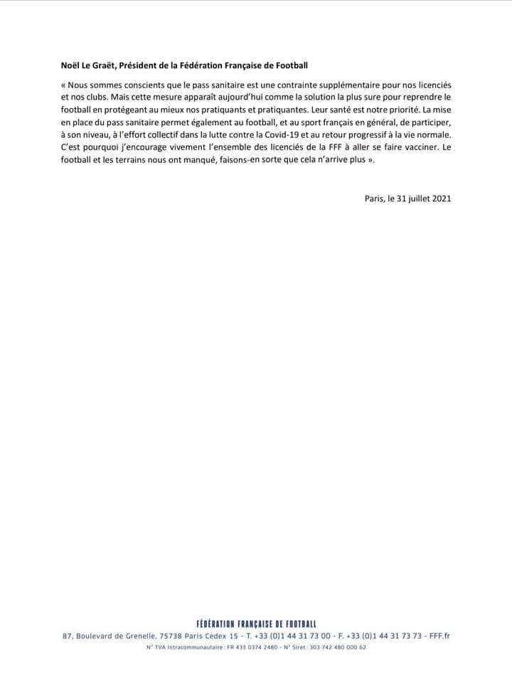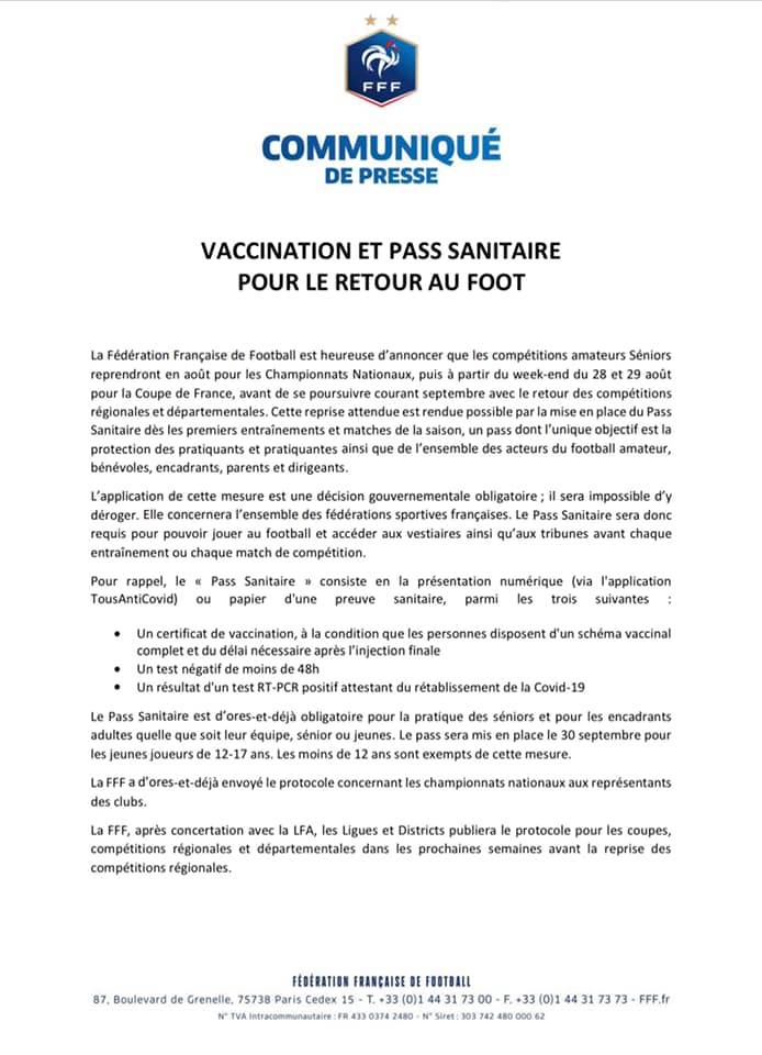 C’était attendu depuis quelques temps, la Fédération Française de Football a publié aujourd’hui un publié détaillant les dates des reprises des championnats amateurs, ainsi que les conditions d’accès en rapport avec le pass sanitaire mis en vigueur par le gouvernement.