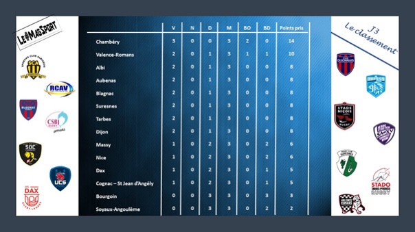 Les premières défaites d’Albi, Blagnac, VRDR ou encore Tarbes et Suresnes, pendant que Chambéry enchaîne un 3 eme succès de rang, et tandis que pour Massy, Dax, Nice et Cognac la première victoire de la saison est enfin arrivée. Cette 3 eme journée de Nationale a surtout été marquée par la 3eme défaite consécutive de 2 favoris à l’accession en Pro D2 : Bourgoin et Soyaux Angoulême. Sans oublier la première victoire à Bourillot de la saison du Stade Dijonnais. Encore un week-end palpitant dans cette 3eme division du rugby hexagonal.