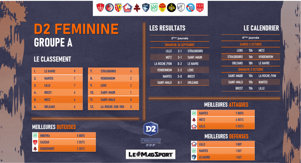 Dans le groupe A, l’US Orléans accueille le leader, le HAC lors de cette quatrième journée. Après le faux pas de la première journée face au Stade Brestois, les Orléanaises ont lancé leur saison avec deux succès face à La Roche et Saint-Malo. Les joueuses de Farid Kebsi attendent impatiemment cette rencontre pour retrouver les sommets de la D2. Pour les Havraises, trois matchs, trois victoires, un parcours sans faute. L’ancien pensionnaire de D1 va passer son second vrai test face à un concurrent direct à la montée. Pour rappel, les joueuses de Frédéric Gonçalves s’étaient imposées lors de la deuxième journée face au FC Metz.