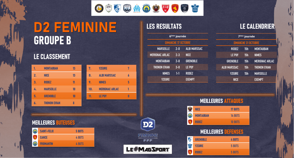 Mentionnons les Nimoises, 9ème après la 6ème journée mais avec un bilan plutôt encourageant surtout lorsque le parallèle est fait avec les résultats de la saison dernière. Après un recrutement important et l’arrivée d’éléments majeurs comme Pognat, Pélissié Manna, Coulibaly ou Pauleau, le calendrier n’était pas favorable. Nimes ayant joué contre les quatre premiers (Montauban, Grenoble, Nice et Rodez). Malgré tout, les Nimoises ont pris des points et ont tenu la comparaison. Reste à cette équipe à prouver sa vraie valeur face à des adversaires à leur portée pour s’éloigner considérablement de la zone rouge.