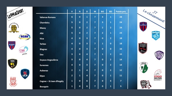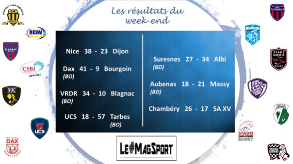 Les équipes de tête ont dû batailler cet après-midi mais elles ont tenu bon : Albi et Massy se sont faits peur respectivement face à Suresnes et Aubenas tandis que Chambéry a su gérer à la maison face à Soyaux-Angoulême. Par contre, Cognac s’est effondré chez lui face à Tarbes.