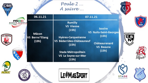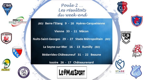 En s’imposant à Berre l’Etang, Hyères-Carqueiranne affirme un peu plus son leadership en ayant maintenant 7 points d’avance sur le 2e et semble être désormais l’équipe à battre de cette poule 2. La défaite un peu surprise de deux points en terre nuitonne (la 2evictoire des Bourguignons cette saison) du Stade Métropolitain permet à La Seyne, vainqueur à l’arraché de Rumilly, de revenir à égalité de même que Bédarrides, auteur d’une grosse première mi-temps face à Beaune mais qui aurait bien pu se faire surprendre en seconde. Vienne n’a pas fait de détail face à Mâcon tandis qu’Issoire lutte encore et toujours comme le prouve sa victoire sur un Châteaurenard pour qui cela semble de plus en plus difficile.