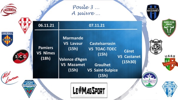 Incroyable poule 3, peut-être la plus disputée des 4. Aujourd’hui, c’est 5 victoires à l’extérieur sur 6 dont 3 de moins de 4 points et 2 avec BO. Mazamet a bien failli faire le coup de la journée face au leader Nîmois tandis que Lavaur et TOAC-TOEC viennent mourir à un point de leurs visiteurs du jour, Valence d’Agen et Marmande. Graulhet continue à être sur son petit nuage en repartant de Castanet – Tolosan avec le BO ainsi que Pamiers à Céret. Seul vainqueur sur ses terres, Saint-Sulpice sur Lèze colle toujours à son objectif de qualification.