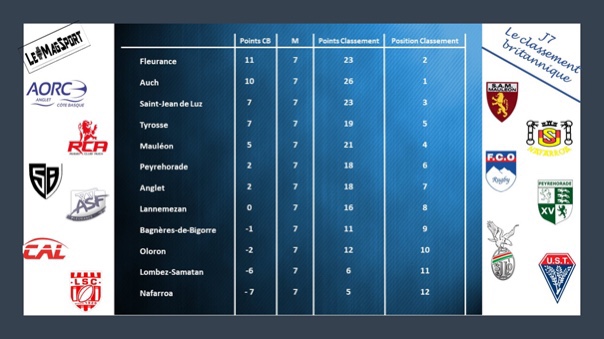 Le promu Peyrehorade continue à faire de la résistance : bien que Mauléon l’ait emporté avec BO, les Landais ont quand même réussi à valider le BD. En s’imposant de 3 points sur les terres de Saint-Jean de Luz, Lannemezan aurait-il enfin lancé sa saison ? Idem pour Nafarroa qui signe son premier succès de la saison face à des Oloronnais qui semblent avoir du mal à trouver leurs marques ? Le leader Auch a disposé de son désormais ex-dauphin Anglet tandis que Fleurance et Tyrosse ont fait le job ce qui leur permet d’asseoir leur position dans la course aux 6 premières places qui est loin, très loin même, d’avoir trouvé son dénouement !